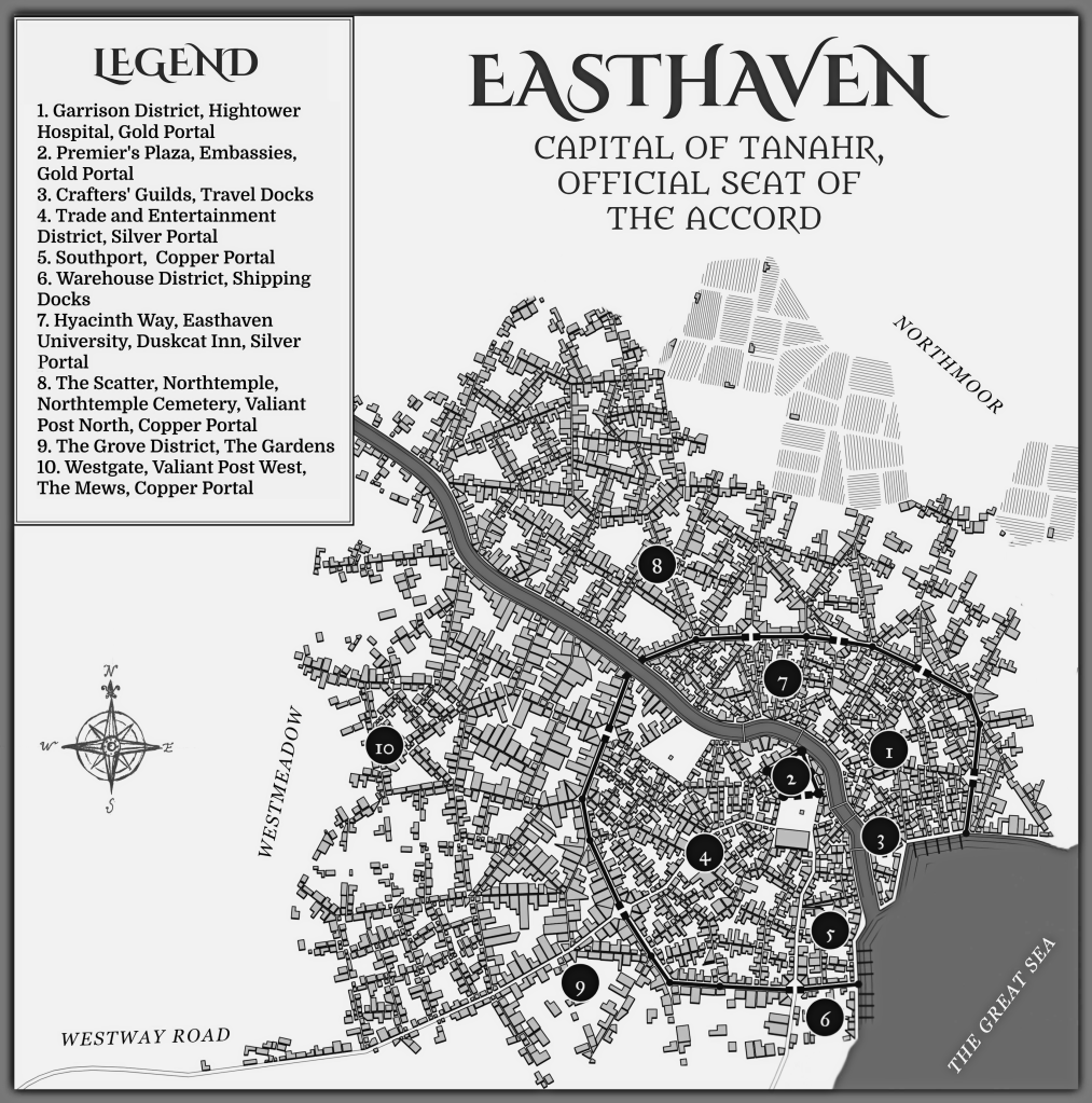 Easthaven’s outskirts offer a variety of vistas. From the stormy waters of the Great Sea to the mouth of the Tanahran River, from picturesque hills to farmlands and vineyards, Tanahr’s capital city borders lovely country.